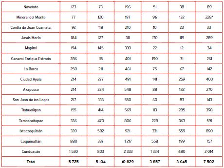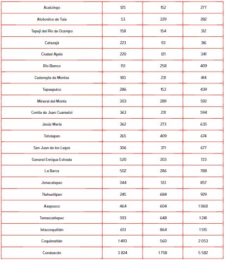 Como se comentó anteriormente, parece ser que hay un equilibrio parcial entre el número de hombres y mujeres que acude a estas IES, pero, ¿qué sucede al final de sus estudios universitarios? En la Tabla 7 se presenta el número de estudiantes que egresaron y se titularon desde el ciclo escolar 2011-2012, cuando se empezó a contar con información a nivel municipal en el Anuario Estadístico, hasta el 2014-2015. En este análisis no se incluyen los casos de Palizada, Ahuacatlán, Aramberrí, San Pablo del Monte debido a que los Anuarios Estadísticos de estos ciclos escolares no cuentan con información sobre estas sedes. Tampoco se incluye el caso de Jonacatepec, dado que aún no reporta egresados.
