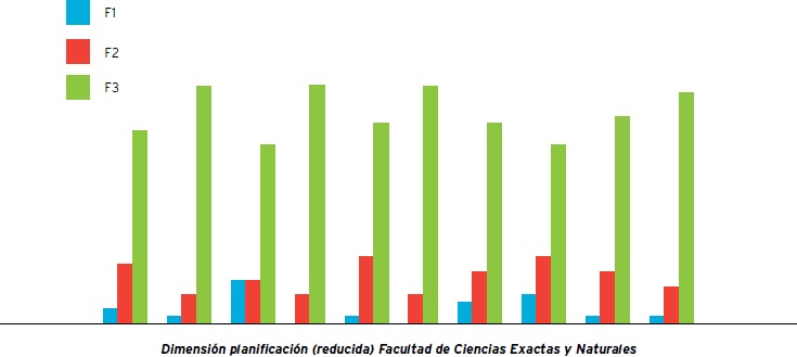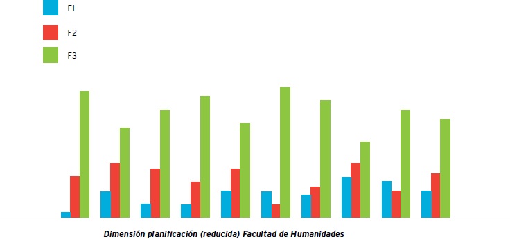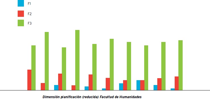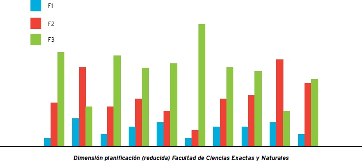 En las Figuras 3, 4, 5 y 6 se muestran los resultados del análisis de cada dimensión de la variable Grado de utilización de estrategias metacognitivas discriminado por facultad (dominio de formación). Los valores F1 (azul), F2 (rojo) y F3 (verde) representan el grado de utilización de cada estrategia de la dimensión: bajo, medio y alto respectivamente.