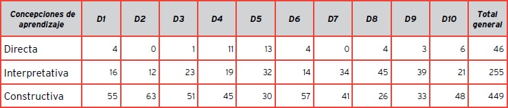 La concepción directa se centra en los resultados del aprendizaje, concebida como una copia fiel de la información o modelo presentado por el docente, sin considerar los procesos y los contextos, y se halla muy cercana a ideas tradicionales o conductistas. La concepción interpretativa supone que la clave fundamental para lograr un buen aprendizaje es la propia actividad del alumno, pero coincide con la concepción directa en que el resultado del aprendizaje debe tener la menor cantidad de distorsiones posibles con respecto al objeto de conocimiento. Se ubica como una posición intermedia que reconoce procesos internos, pero continúa poniendo el énfasis en el resultado. Por último, la concepción constructiva supone una transformación del contenido de aprendizaje al ser aprehendido por el sujeto e implica procesos mentales reconstructivos de las propias representaciones.