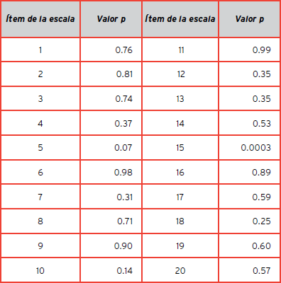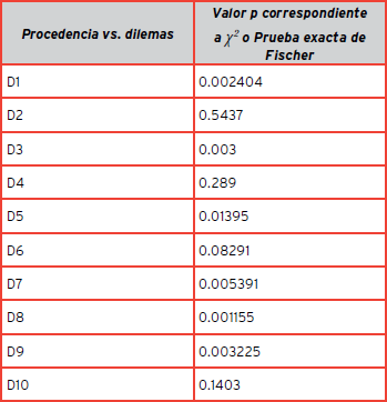 En la Tabla 2 se muestra el valor p correspondiente a la prueba de hipótesis de independencia de χ² o a la prueba de hipótesis de Fischer.