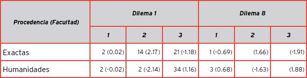 En la Tabla 3 se muestran en forma más detallada las frecuencias observadas y entre paréntesis los residuos, correspondiente a la tablas de contingencia de procedencia (facultad) vs. dilema 1 y de procedencia vs. dilema 8. Se decidió seleccionar los dos dilemas que obtuvieron valores p más pequeños, entre los seis que mostraron una asociación estadísticamente significativa.