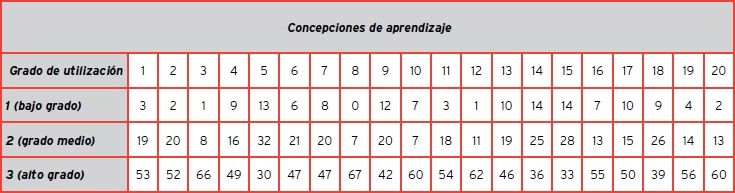 La Tabla 4 expone los resultados del total de la muestra para la escala completa de estrategias metacognitivas reducidos a tres categorías de respuesta y agrupados por grado de utilización (bajo, medio y alto).
