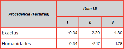 Si se observa la Tabla 5, puede verse que el ítem 15 de la escala de estrategias, es el único que presenta evidencia estadísticamente significativa para rechazar la independencia con la V3, dominio de formación disciplinar. En la Tabla 6 se muestran los residuos correspondientes a la tabla de contingencia entre las facultades y el ítem 15 de las estrategias metacognitivas, pudiéndose establecer que el ítem 15 se encuentra estadísticamente asociado a ambas facultades con el grado medio de uso de estrategias.