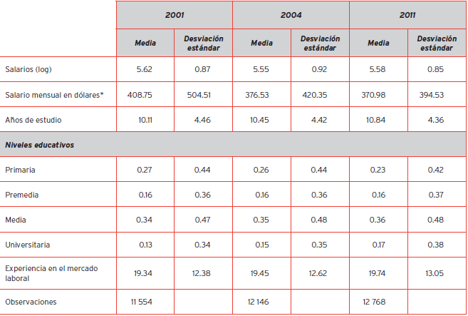 Las muestras utilizadas las constituyeron 11 554 individuos de 15 años y menores de 66 en el año 2001, 12 146 y 12 768 respectivamente en el 2004 y 2009. Panamá cuenta con una población asalariada dotada de 10.84 años de escolaridad para el último año de estudio. Es posible que se muestren algunos resultados en materia educativa por efecto de políticas educativas como el de la transformación curricular (ley 34 de julio de 1995), que sirvió de fundamento a la Estrategia Decenal de Modernización de la Educación Panameña (1997-2006) y las transferencias monetarias condicionadas para reducir la pobreza (red de oportunidades) en el 2006, con la obligación de que los niños asistan a la escuela y participen de los programas de salud. Además, se crea la ley de Sedes de Empresas Multinacionales (SEM), en la que pueden laborar hasta un 10% de extranjeros. Se observa un gran número de trabajadores migrantes en el marco de la ley y fuera de ésta de todas partes del mundo, por situación política y por los efectos de la crisis financiera de 2008, es posible que la migración se incremente.