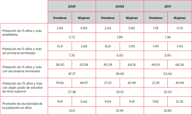 La evolución de los indicadores sobre características educativas en Panamá (tabla 2) pone de manifiesto que el porcentaje de la población de 15 años y más analfabeta se ha reducido en 1.35% en 2009 con respecto a 2001; por género se observa mayor reducción en los varones. También se muestra un avance importante en la educación primaria: en el último año analizado, la población que no había terminado este nivel educativo se redujo en 1.4% con respecto al primer año. Cabe mencionar que el valor alcanzado por el porcentaje de la población con 25 años y más con algún grado de estudios de nivel superior ascendió a 4.64% en 2009, frente a 2001.