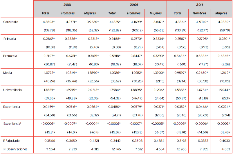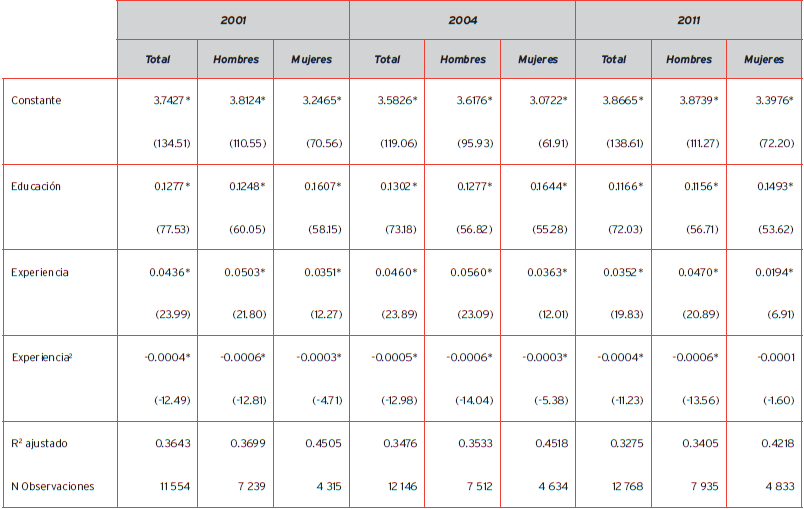 En la tabla 3 se muestra que el 33% y el 45% de los salarios son explicados por la educación, la experiencia y su cuadrado, tanto para los varones como para las mujeres, en todos los casos este porcentaje es mayor para el sexo femenino. Los coeficientes de las variables que explican los salarios resultaron significativos y presentan el signo adecuado. Los resultados obtenidos indican que los años de educación y la experiencia tienen un impacto positivo y significativo en los salarios. La tasa de rentabilidad de la educación resultó 12.77%, 13.02% y 11.66% respectivamente en 2001, 2004 y 2009. Las mujeres en el periodo estudiado conservan 3.4 rendimientos superiores a los varones en el último año analizado.