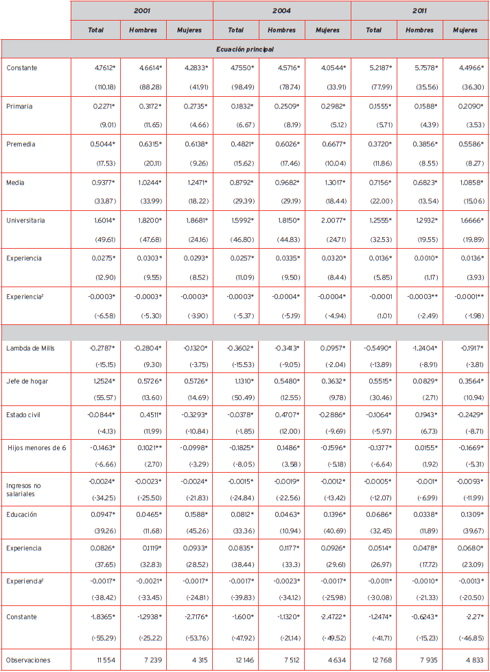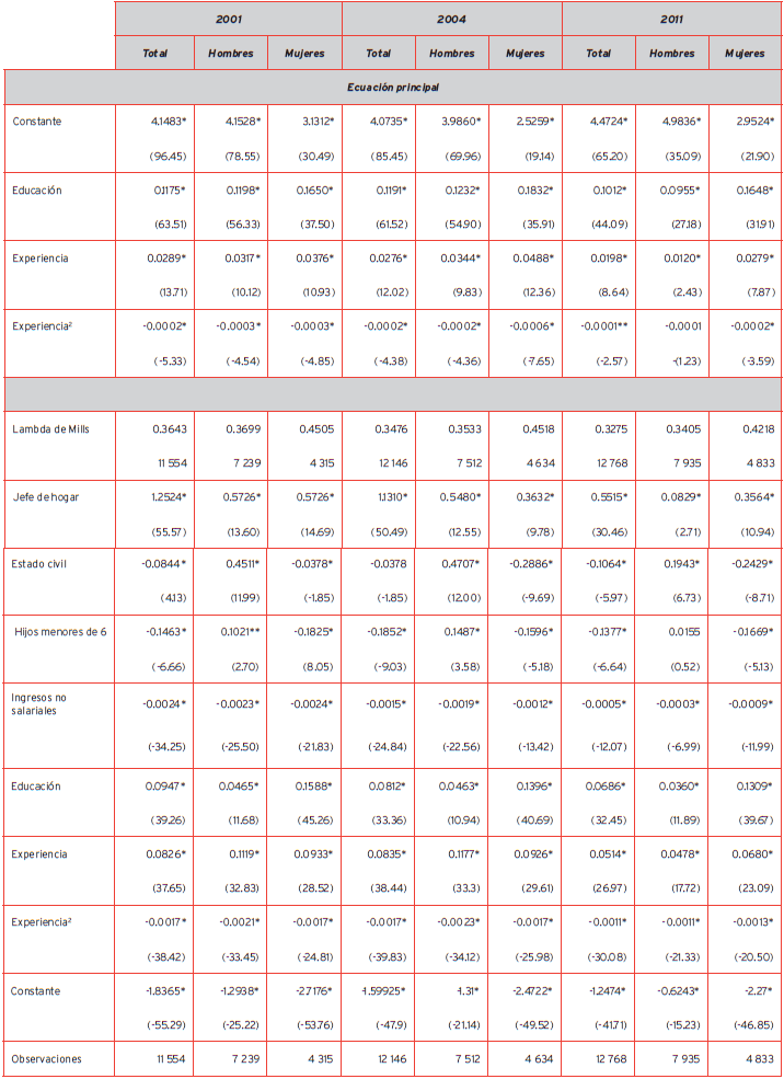 Uno de los problemas econométricos asociados con el cálculo de los rendimientos de las inversiones educativas es el sesgo de selección muestral. En la tabla 4 se presentan los resultados para los años de estudio del modelo de Mincer utilizando el procedimiento bietápico de Heckman.