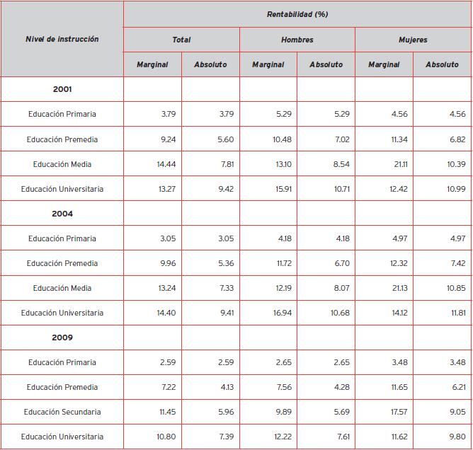 En los rendimientos absolutos por género, disminuyeron en todos los niveles de estudio, no obstante, la mayor reducción afecta a los grupos de educación media y universitaria. Estos cambios se pueden aducir a los altos niveles promedios medidos en años de estudio de las mujeres en todas las áreas del conocimiento en comparación con los hombres.