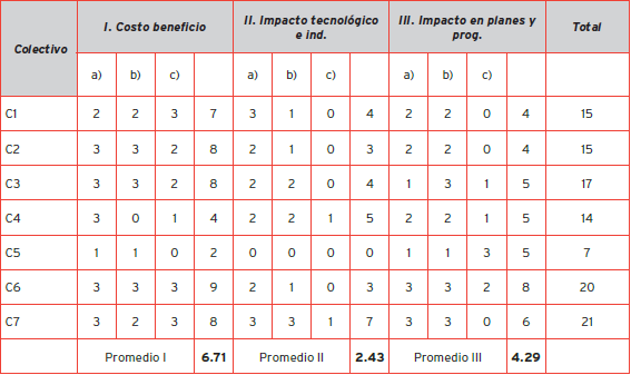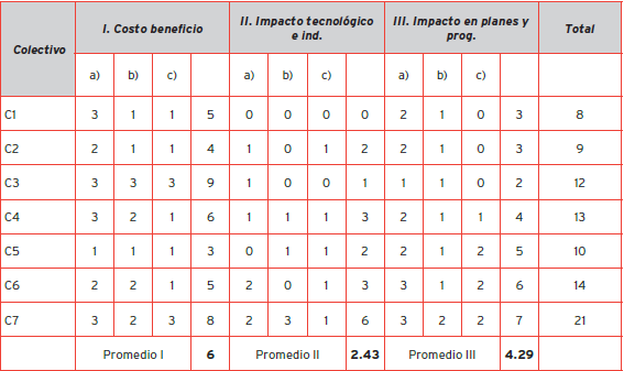 De las tablas anteriores se pueden extraer algunas conclusiones. Por brevedad, sólo consideramos tres colectivos. Los integrantes del colectivo C7, que es el mejor evaluado, en su mayoría no poseen la máxima habilitación académica ni pertenecen al SNI. No obstante, en el primer año este colectivo mostró un modelo de funcionamiento muy productivo, con líneas de investigación bien definidas, múltiples relaciones de trabajo con el sector productivo, instituciones del sector gubernamental, comunidades productoras y programas de gestión en la UAM.