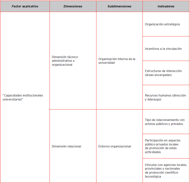 Con la primera dimensión, se analizó el contexto normativo-institucional y de acción, es decir las características económicas, sociales, políticas generales y particulares, que enmarcan a las universidades, realizando una aproximación a las condiciones donde los las universidades desempeñan sus actividades. Con la segunda dimensión, se amplió el análisis a las organizaciones y los actores involucrados en el desarrollo de las políticas de vinculación y el tipo de relación que la universidad establece con los actores públicos y privados. Con la tercera dimensión, se profundizó el estudio en torno a la universidad y a sus características internas, en relación con el tipo de gestión, los incentivos propuestos, los recursos humanos, particularmente su capacidad de dirección y liderazgo hacia adentro y hacia fuera de la organización. Esta dimensión a su vez se combinó con el abordaje propuesto por Clark (1998) que permite orientar el análisis hacia distintos aspectos organizacionales puntuales que complejizan el análisis.