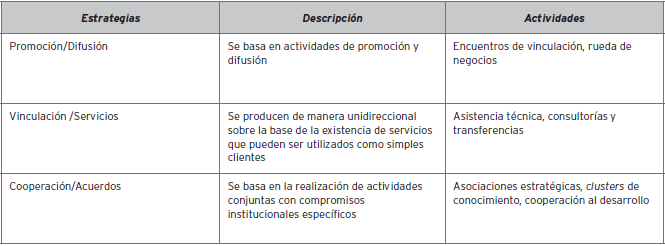 Para la medición del nivel de vinculación (madurez de los vínculos) en las universidades estudiadas en Argentina, se creó un indicador cualitativo a partir de la identificación de las estrategias utilizadas por las universidades. La variable nivel de vinculación parte del enfoque teórico propuesto por Etzkowitz y Leydesdorff (2012) y la subsecuente revisión y aporte hechos por Sebastián (2000).12 Consta de tres tipos de estrategias:13 a)las estrategias de promoción y capacitación, b)las estrategias de servicios y c)las estrategias de cooperación institucional que -según la intensidad de los vínculos (2000)- dan cuenta de un mayor o menor nivel de vinculación14 de las universidades en torno al tema propuesto. En este sentido, la existencia o no de las distintas estrategias en el balance final de cada universidad nos indicará el grado de madurez de los vínculos.