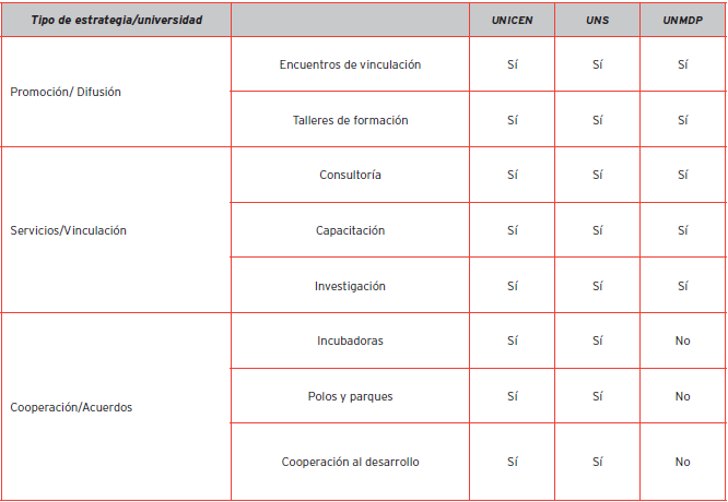 En los casos de mayor vinculación se observa la existencia de una red colaborativa con actores locales y la participación de la universidad en espacios de articulación público-privado especializados en la temática (Centro IDEB Tandil,28 CEPIT,29 Polo y Agencia de Ciencia y Tecnología en Bahía Blanca). En cuanto al primer punto, se pudo evidenciar que dependiendo de la estrategia a implementar -sobre todo en las estrategias de promoción y cooperación- se genera una gestión conjunta entre la universidad y las agencias locales para responder a las demandas del medio. Sin embargo, en el caso de menor vinculación, se pudieron constatar relaciones más de tipo individual y menor propensión a la participación en espacios de articulación público-privada local.