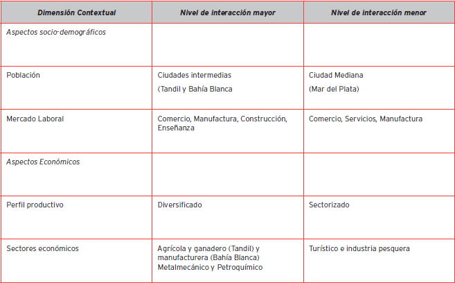 Asimismo, se advierten altos niveles de desempleo22 que están relacionados con las características de la dinámica productiva, así como con las características del mercado laboral. En este sentido, como se aprecia en la tabla 5, la principal diferencia en el contexto de acción entre ambas categorías deriva de las características del perfil productivo (diversificado o sectorizado). Asimismo, otro aspecto diferencial es la densidad poblacional, en el caso de Mar del Plata la población es mucho mayor (615 350 habitantes) que en el caso de Tandil y Bahía Blanca (116 916 y 299 101 habitantes, respectivamente).