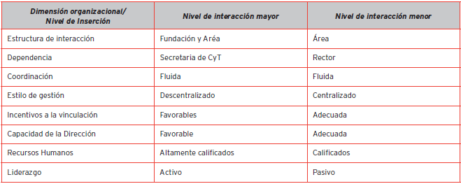 Dentro de la dimensión organizacional y administrativa se pueden señalar acuerdos en la coordinación interna y diferencias en los incentivos orientados a la vinculación, en las estructuras de interacción (tipo y dependencia), el estilo de gestión y la capacidad de dirección (formación y liderazgo).