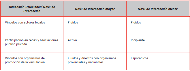En cuanto a la dimensión relacional, los acuerdos se relacionan con los vínculos individuales con actores locales; las diferencias se pueden encontrar en la participación de la universidad en redes y espacios de articulación público-privada y en los vínculos con organismos de promoción de la vinculación.