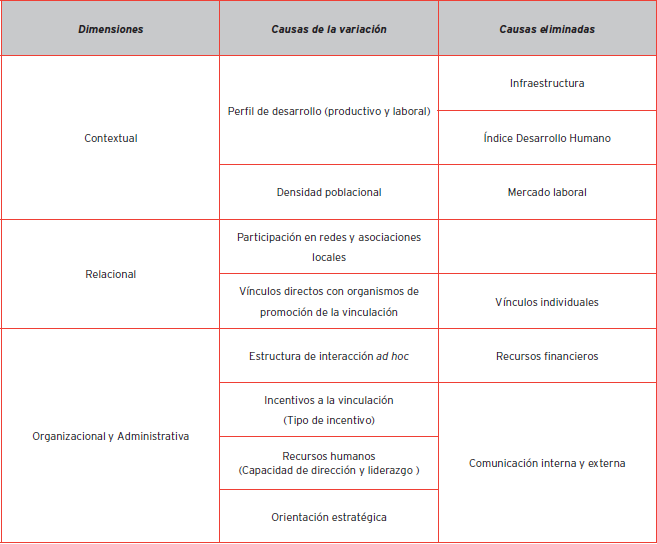 Del análisis de los casos en función de los acuerdos y las diferencias se pueden extraer aquellos factores asociados a la vinculación de las universidades de tamaño mediano de la Provincia de Buenos Aires. A continuación, se expresan los elementos analizados en cada una de las dimensiones de las “capacidades institucionales universitarias” distinguiendo aquellas consideradas como las causantes de la variación de la vinculación y aquellas eliminadas. Entre las causas eliminadas, se encuentran a su vez explicaciones o elementos que influyen en las dinámicas de vinculación de estos actores, sin embargo, a través del método del acuerdo y la diferencia se logró determinar que no influyen en la vinculación al estar presentes en todos los casos.