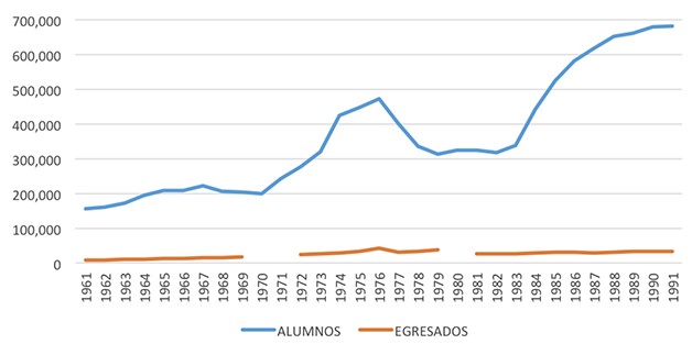 Es evidente, por tanto, que no sólo no se logró incrementar la tasa de egresos, sino que en el mejor de los casos se mantuvo al nivel de la primera mitad de la década de 1960. La única excepción la podemos encontrar durante el último periodo militar, en el cual se logró un aumento de la tasa de egresados por medio de una drástica reducción en la matrícula.