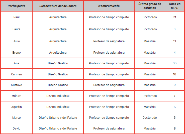 A partir de los requisitos, la muestra fue intencional estratificada para obtener la visión de un grupo relativamente homogéneo -diseñadores que dan clases en la FH- y conseguir una gama heterogénea de perspectivas -diferentes contratos, distintos tiempos dentro de la institución, diversos grados académicos y varias especialidades del diseño- (Patton, 2002).