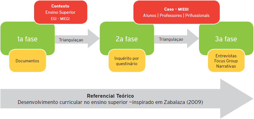 O estudo que se apresenta neste artigo procura analisar de forma integrada três dimensões que configuram um modelo de desenvolvimento curricular no ensino superior: elementos do currículo, competências e perfil profissional, considerando um caso particular-MIEGI (Mesquita, 2015). Neste sentido, o design metodológico segue uma abordagem dominantemente qualitativa e, por isso, estabelece-se uma relação direta entre a problemática em análise e os dados. Trata-se de uma pesquisa que se desenvolveu em três fases durante três anos consecutivos (2010-2013), tal como se ilustra na Figura 1, numa evolução do seu contexto para o aprofundamento da análise do estudo de caso com base nas perspetivas dos alunos, dos professores e dos profissionais, sustentadas pelo referencial teórico desenvolvido ao longo da investigação.
