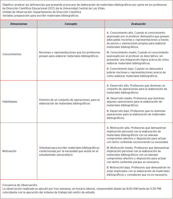 Sobre la base de los fundamentos teórico-metodológicos expuestos antes, se realizó un diagnóstico de los profesores en el Departamento de Dirección Científica Educacional (DCE), ahora integrado al Centro de Estudios de Dirección de la Universidad Central “Marta Abreu” de Las Villas, Cuba, con un total de 15 profesores, de ellos el 60% (9) son doctores; el 40% (6) maestros y el 86 % ostenta categorías superiores (9 PT y 4 PA), para conocer si estaban preparados para elaborar los materiales bibliográficos para sus alumnos.