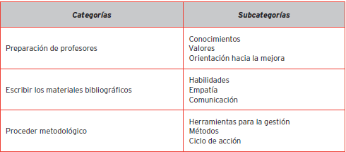 En total, se realizaron 20 sesiones de trabajo en las que emergieron categorías y subcategorías claves para la preparación de los profesores en la escritura de sus materiales bibliográficos. Éstas se evidencian en la Tabla 1.