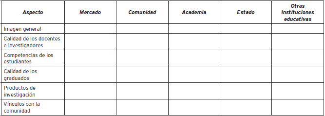 Implicancias para la imagen organizacional. Para Mintzberg (1992), toda organización posee un público portador de intereses, el cual puede ser clasificado en: a) grupos tan generales como las familias o los líderes de opinión pública; b) grupos con intereses especiales, como las sociedades científicas cuyo principal fin estatuido es promover el desarrollo del conocimiento en la disciplina de la que se trate; c) el gobierno en todas sus facetas. Mediante el empleo de esta herramienta es posible explorar: quiénes son los agentes considerados por los participantes como más relevantes (por ejemplo, el mercado laboral, la Academia, los Colegios Profesionales), así como la percepción que los participantes poseen de la imagen que los agentes externos tienen de la universidad.