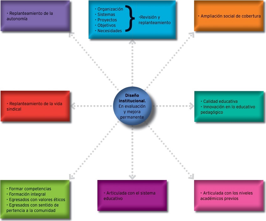 Las cuestiones relativas al diseño institucional y a la gobernanza universitaria conducen al análisis de contenidos curriculares y de métodos de enseñanza-aprendizaje (Tünnermann, 2006; Gómez, 2000). También implican el análisis de la congruencia entre el proyecto institucional y la forma en la que se tienen organizados los recursos para la obtención de resultados. Esto conduce directamente a la atención de la manera en la cual se organizan y operan internamente las instituciones, así como al modo en que se relacionan con entidades externas, con vistas a asegurar el alcance de los objetivos de la educación superior y, en especial, el logro del proyecto educativo de la institución particular de que se trate. Se refiere a la manera en que se organiza para atender aspectos medulares, tales como hacia dónde se dirige la educación que se imparte, a qué sociedad se está formando, para qué tipo de ciudadanos se imparte la educación, qué se enseña y cómo se enseña.