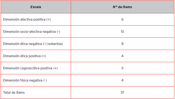 Dimensión ética positiva (+): seguridad acerca de lo que se considera bueno y de las conductas correctas que se deben realizar para las personas y para la sociedad. Dimensión ética negativa (-): conductas soberbias.