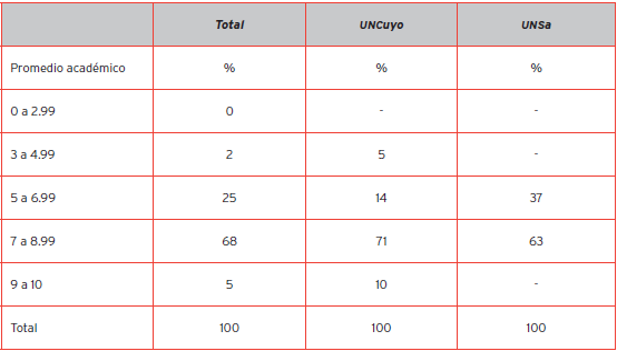 Finalmente, para medir la variable rendimiento académico se utilizaron los promedios de los estudiantes al momento del relevamiento, según lo establecido en sus respectivos estados curriculares consultados en los correspondientes departamentos de alumnos. Tales puntajes han sido elegidos como instrumentos para la medición del rendimiento académico, ya que se trata de una medida que sintetiza el desempeño del estudiante a lo largo de su trayecto formativo no concluido (desde el ingreso a la carrera hasta el momento de la encuesta).