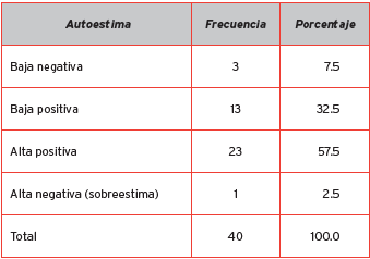 Según se señaló, la sumatoria de las puntuaciones de la totalidad del instrumento (40 ítems) se agrupan en cuatro categorías de autoestima. Desde esta categorización del autor (Toro-Vargas, 1994), los resultados pueden verse en la Tabla 5.