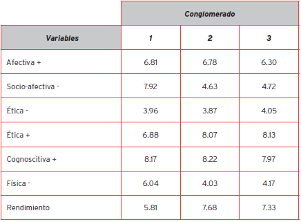 De acuerdo con las características obtenidas de la población investigada y, según lo analizado, se advierte la constitución de dos perfiles psicosociales claramente demarcados. Por un lado y, en correspondencia con el primer conglomerado, se halla un primer perfil caracterizado por aspectos negativos: dimensión socio-afectiva negativa alta, dimensión ética positiva más baja que los otros dos conglomerados, física negativa más alta y evidencia el rendimiento inferior de la muestra. Por otro lado, los valores arrojados por el segundo y tercer conglomerado posibilitan su unificación conformando un perfil representado por aspectos positivos: puntuación baja tanto en el área socio-afectiva negativa como en la física negativa de la autoestima, una dimensión ética positiva alta y un rendimiento superior, siendo ligeramente más alto el del segundo conglomerado.