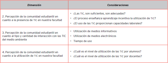 El diseño del instrumento completo examina cinco dimensiones; en este artículo se contemplan tres (dimensiones 2, 3 y 4, ver Tabla 1).
