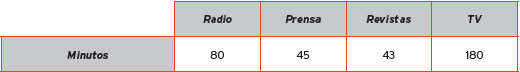 Con respecto al tiempo que le dedican a estos medios, en la Tabla 2 se observa que se privilegia la utilización de la televisión con un promedio de 180 minutos por día, en contraste con las revistas con tan solo 43 minutos por día.