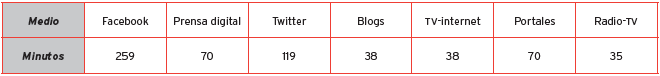 Con respecto al tiempo que dedican a estos medios electrónicos, en la Tabla 3 se observa que el mayor tiempo se invierte en Facebook con 259 minutos promedio por día, seguido de Twitter con 119 minutos promedio, mientras que sólo dedican 35 minutos promedio por día a la radio vía internet.