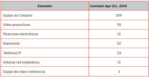 Con los datos de las Tablas 6 y 7, si se considera un universo de estudiantes de 3 851 y 309 equipos de cómputo, se tendría un equipo por cada 12 alumnos, aproximadamente; ésta es una buena posición, considerando el parámetro que definió la OEI (2010), de un equipo por cada 40 alumnos para el año 2015. Esta medida ha quedado un tanto rebasada y es poco adecuada, ya que actualmente no se puede establecer la cobertura con la cantidad de equipos administrados directamente por las entidades educativas en sus espacios áulicos, debido a que en un concepto más amplio se debe tener en cuenta el acceso que tienen los alumnos a otros dispositivos personales de conexión tales como laptops, teléfonos celulares, asistentes digitales y tabletas, entre otros.