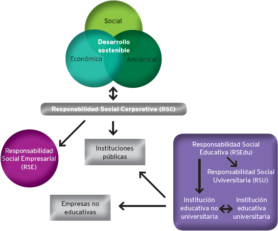 La RSC hace referencia a la responsabilidad social propia de todas las organizaciones: con ánimo de lucro y sin ánimo de lucro; públicas y privadas; orientadas a la venta de productos o a la prestación de servicios (algunos más accesorios como agencias de viajes u otros más esenciales como hospitales, cuerpos de seguridad, bomberos o centros educativos). Dentro de este contexto, se entiende que la RSC, cuando se habla de empresas, sea sinónimo de RSE. Sin embargo, el término RSE es menos amigable que el concepto de RSC para organizaciones como instituciones públicas, ONG, instituciones educativas, instituciones sanitarias, etcétera. Es posible entender la RSC de las instituciones educativas como RSEdu que, a su vez, según la naturaleza de la organización, debe contribuir a que el resto de instituciones vivan su responsabilidad social en materia educativa. En este sentido, la RSC de la universidad -que a su vez es RSEdu como institución educativa- se reconoce como RSU con sus particulares aportaciones desde la investigación, la capacitación y la innovación para servir al reto común de la responsabilidad social con vistas al desarrollo sostenible.
