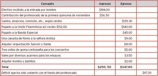 El 11 de diciembre del mismo año (AHUNAM, FUN, sección DA, c. 61, exp. 2092, ff.21855-21856), el maestro Estanislao Mejía envió al Secretario General de la Universidad Nacional una relación de los ingresos y egresos del 5º Concierto de la Orquesta Sinfónica de la Facultad de Música. En la Tabla 1 se puede apreciar de qué manera se destinaban los recursos económicos para la realización de una presentación de la orquesta sinfónica de alumnos, así como la cantidad que finalmente cubría el fondo del profesorado.