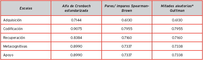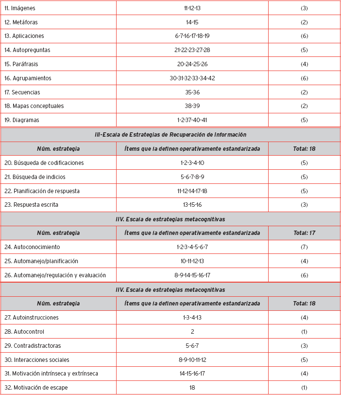 La validez de contenido fue calculada mediante el “método de juicio de expertos” y fue la siguiente: r = 0.87 para la escala I, r = 0.89 para la escala II, r = 0.91 para la escala III, r = 0.88 para la escala IV y r = 0.88 para la escala V. La validez de constructo, calculada mediante el “método de juicio de expertos”, fue de: r = 0.87 para la escala I, r = 0.87 para la escala II, r = 0.89 para la escala III, r = 0.88 para la escala IV y r = 0.88 para la escala V. De igual forma, la validez de constructo calculada mediante el “método de grado de acuerdo”, y que proporciona valores análogos a los de una correlación, arrojó los siguientes valores: r = 0.9062 para la escala I; r = 0.8664 para la escala II; r = 0.9746 para la escala III; r = 0.9591 para la escala IV y r = 0.9591 para la escala V. Respecto a la fiabilidad del instrumento, los resultados por escala son mostrados en la Tabla 1; en la Tabla 2 se ilustran las estrategias que componen cada escala y los ítems que las definen operacionalmente.