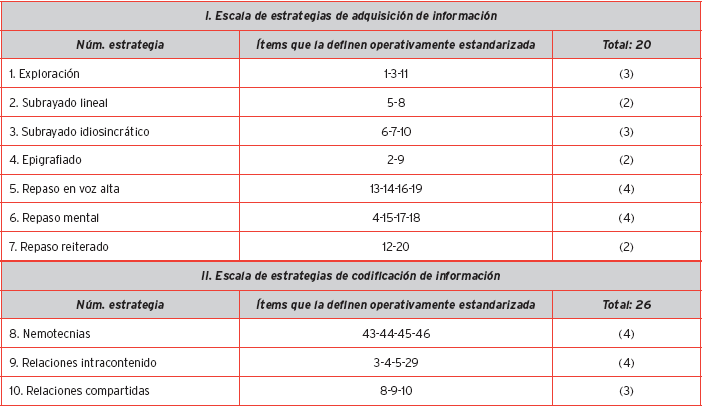 Además, este instrumento de autoinforme, inspirado en los principios cognitivos de procesamiento de la información, permite evaluar de forma cuantitativa y cualitativa diversas estrategias cognitivas generales que utilizan los estudiantes en el aprendizaje que tiene lugar durante la actividad de estudio en sus distintas fases. Consta de un cuestionario que se conforma de: 20 preguntas para la escala de Adquisición; 46 para Codificación; 18 para Recuperación; 17 para Metacognitivas y 18 preguntas de la escala de Apoyo; además de una hoja de respuesta.