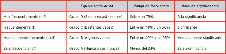 Para la variable Rendimiento Académico, en la asignatura de Competencias Comunicativas Integradas en Inglés II: Vida Cotidiana, se utilizó la técnica de registro de notas, en la cual se identificó la nota obtenida por cada miembro de la muestra. Estos datos fueron solicitados formalmente a la Dirección de Escuela de la carrera en cuestión. Para efectos del estudio se incluyó la nota promedio obtenida al final del curso en la habilidad de “Reading”, toda vez que las estrategias ACRA apoyan el proceso de lectura comprensiva. En cuanto al análisis de datos, en relación con el objetivo específico 1, se realizó un análisis global del porcentaje de uso que los estudiantes declaran hacer de las 32 estrategias de aprendizaje ACRA, tomando como referencia que el rango de frecuencia de utilización sería determinado por el porcentaje de uso que los alumnos declara hacer de la estrategia respectiva. De esta forma, se procedió a realizar los siguientes pasos: para detectar la frecuencia de uso de cada uno de los grupos de estrategias (Adquisición, Codificación, Recuperación, Metacognitivas y Apoyo) por separado, se procedió a contar las A, B, C y D tabuladas a partir de las respuestas emitidas por los estudiantes. Luego, para representar analíticamente la frecuencia de uso de las diferentes estrategias de aprendizaje que los estudiantes declararon hacer, se confeccionó una serie de tablas que presentan la frecuencia de uso clasificada en cuatro niveles: “Muy frecuentemente” (mf), equivalente al grado D de las escalas ACRA (siempre o casi siempre); “Frecuentemente” (f), equivalente al grado C (bastantes veces); “Medianamente frecuente” (mdf), equivalente al grado B (algunas veces) y “Baja frecuencia” (bf), equivalente al grado A de las ACRA (nunca o casi nunca). Posteriormente, a cada uno de los niveles se asignó un rango de frecuencia acorde al porcentaje de uso, y se establecieron cuatro niveles de significancia en relación con la frecuencia de uso antes mencionada. La Tabla 3 ilustra estos rangos.