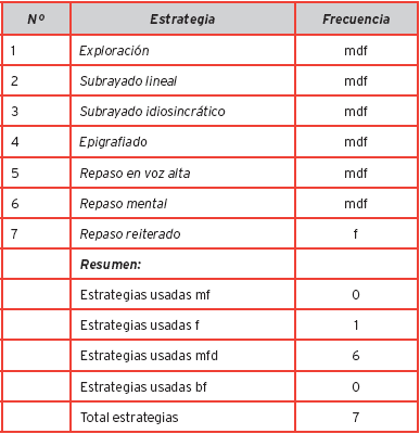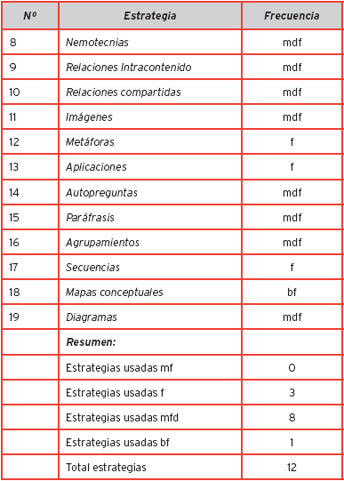 En cuanto a las estrategias usadas a nivel “Medianamente frecuente” (mdf), esto es, en un rango de frecuencia entre el 25% y el 49%, y por tanto consideradas como de “Mediana Significancia”, tenemos 15 estrategias: “Exploración”, “Subrayado lineal”, “Subrayado idiosincrático”, “Epigrafiado”, “Repaso en voz alta”, “Repaso mental”, “Nemotécnias”, “Relaciones intracontenido”, “Relaciones compartidas”, “Imágenes”, “Autopreguntas”, “Paráfrasis”, “Agrupamientos”, “Diagramas” y “Autocontrol”, lo cual representa el 46.8% del total de estrategias.