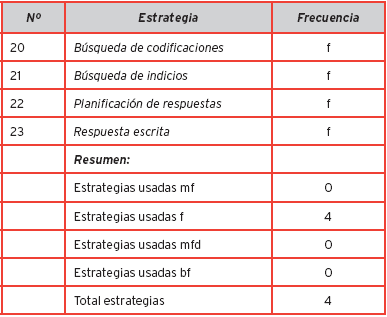 Los datos de frecuencia de uso de estrategias en cada una de las cinco escalas ACRA son presentados en las siguientes tablas.