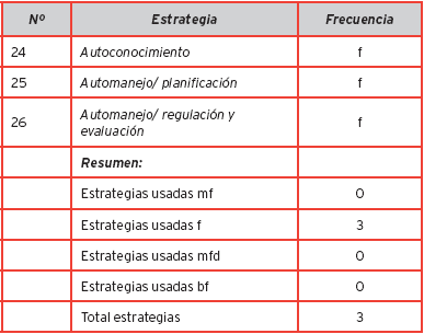 Respecto a la escala de Estrategias Metacognitivas (Tabla 7), las cuales suponen y apoyan, por una parte, el conocimiento que un individuo tiene acerca de los propios procesos en general, y de estrategias cognitivas de aprendizaje en particular, y por otra, la capacidad de manejo de las mismas, las tres estrategias que la componen, “Autoconocimiento”, “Automanejo/planificación”, y “Automanejo/regulación y evaluación”, los resultados obtenidos indican que estas estrategias son significativas en cuanto a su frecuencia de uso, ya que se ubicaron en un rango de utilización del 50% a 74% (f).