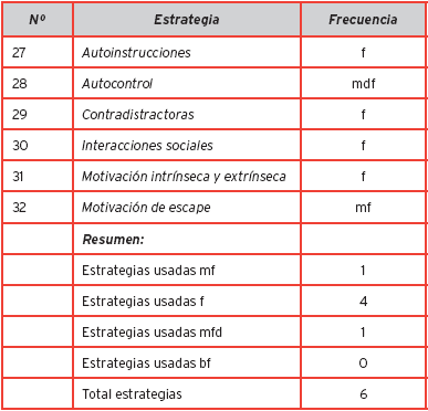 Al analizar la Tabla 8, Estrategias de Apoyo, las cuales “apoyan”, ayudan y potencian el rendimiento de las estrategias de Adquisición, Codificación y las de Recuperación, incrementando la motivación, la autoestima y la atención, en otras palabras, garantizando el buen funcionamiento de todo el sistema cognitivo, tenemos que “Motivación de escape”, referida a la habilidad para activar, regular y mantener la conducta de estudio, se detectó en rango “Muy frecuente”, es decir, fue muy significativa con más del 75% de uso; las estrategias de “Autoinstrucciones”, “Contradistractoras”, “Interacciones sociales” y “Motivación intrínseca y extrínseca”, se presentan con una frecuencia de uso de 50% a 74%, esto es, con uso “Frecuentemente” (f), y por lo tanto son significativas en cuanto a su frecuencia de utilización. Finalmente, la estrategia “Autocontrol”, que se relaciona con la capacidad de la persona para controlar estados psicológicos, como por ejemplo la ansiedad, se manifestó a nivel de “Mediana frecuencia” (mdf) y por lo tanto sólo mediana significancia.