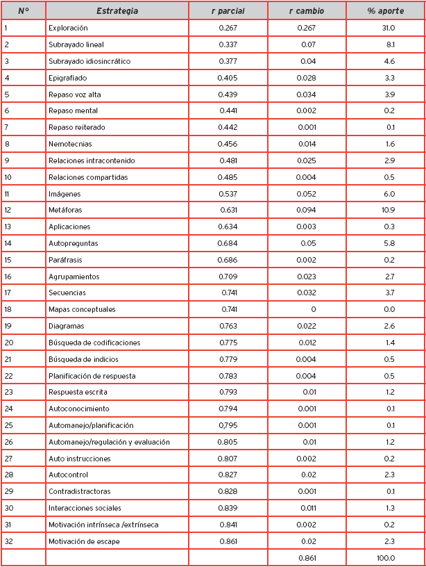 Repaso mental, de la escala de Adquisición; Paráfrasis, de Codificación; Auto instrucciones y motivación intrínseca y extrínseca, ambas de la escala de Apoyo al procesamiento, las cuales aportan en el rango de 0.2%.