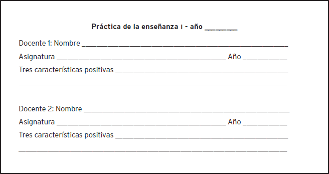 El primer día de clase se llevan las fichas con datos de docentes memorables (Fig. 1), completadas durante los últimos años, separadas en sobres según cohorte. Cada estudiante extrae la ficha que completó cuando cursó Práctica de la Enseñanza I (la reconoce él mismo, pues había sido completada de manera anónima). A continuación se solicita que: