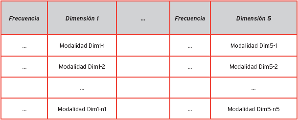 Las cualidades, expresadas en la forma en que lo hicieron los aspirantes a profesor, se constituyen en las modalidades del estudio. De este modo cada dimensión queda conformada por una cierta cantidad de modalidades (cualidades distintas entre sí): 73 en la dimensión 1 (n1=73), n2=151, n3=156, n4=158 y n5=46.