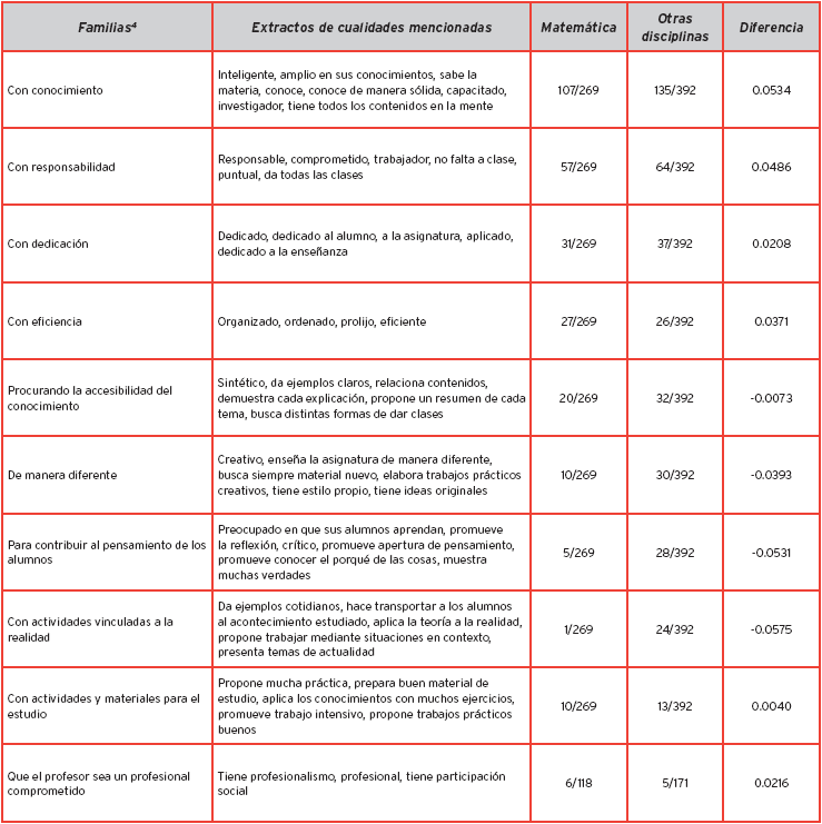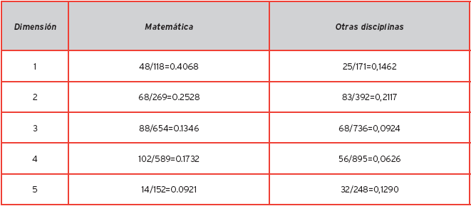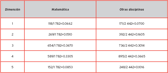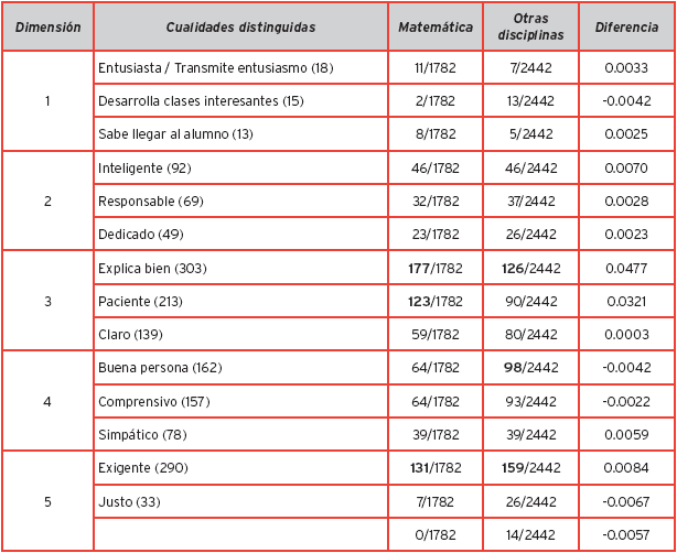 En la Tabla 2 se presenta la frecuencia de cualidades en cada dimensión, tanto para los registros relativos a profesores en Matemática como de otras disciplinas (por ejemplo, 118 y 171 respectivamente para la dimensión 1). Se la compara, a su vez, con respecto a la frecuencia total de cualidades (1 782 y 2 442, respectivamente). Esto con el propósito de conocer comparativamente la distribución de cualidades por dimensión.