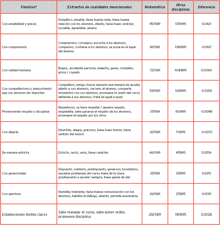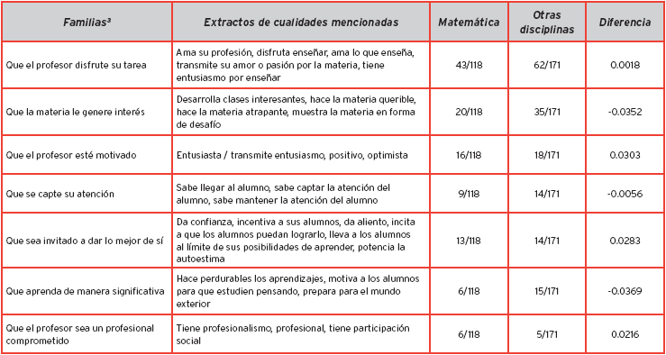 En efecto, la máxima diferencia registrada se presenta en la familia de cualidades que aprenda de manera significativa, con un 3.69% a favor de las cualidades correspondientes a docentes de otras disciplinas. Le siguen que la materia le genere interés con 3.52% también a favor de docentes de otras disciplinas y que el profesor esté motivado, con 3.03% a favor de los profesores en Matemática. Esto recalca la importancia de la propia motivación del profesor en Matemática para motivar a su vez a sus alumnos en la clase.