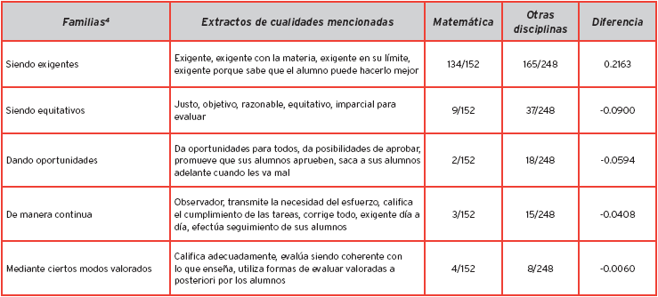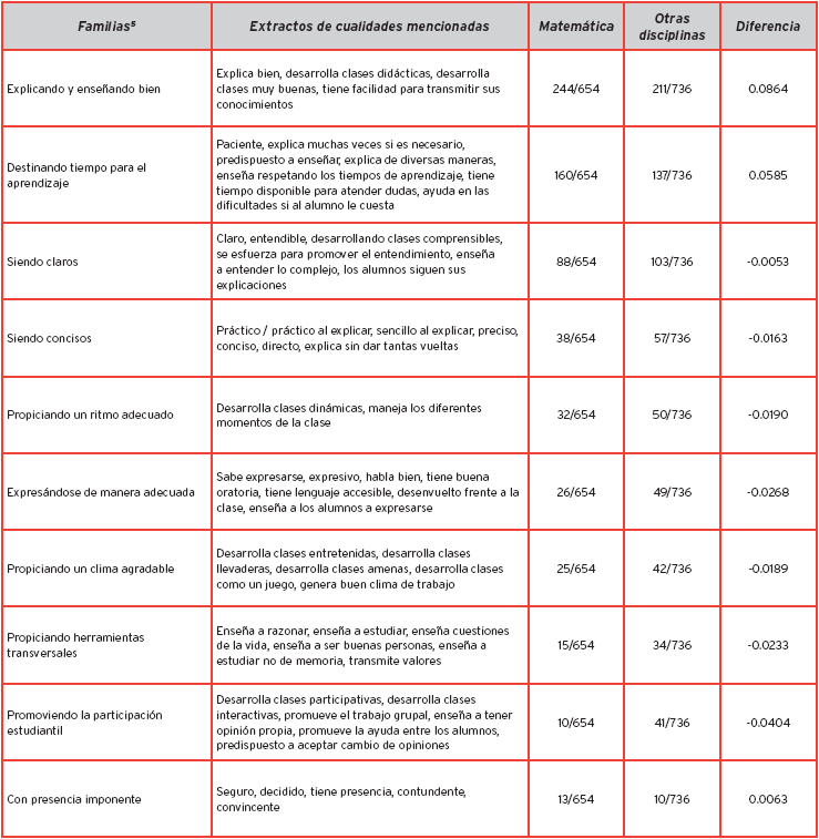 En las Tablas 4 a 8 se recorren las familias emergentes por cada dimensión de análisis. Se acompañan de algunos extractos de cualidades mencionadas por los estudiantes para ilustrar las ideas allí contenidas. Para cada una se consignan las frecuencias respectivas registradas en los profesores en Matemática, así como de otras disciplinas, en comparación con la frecuencia total de la dimensión (por ejemplo, en la dimensión 1, 118 para profesores en Matemática y 171 para los de otras disciplinas). Finalmente, se explicitan las diferencias entre las frecuencias relativas de cada familia presentes en los profesores en Matemática y de otras disciplinas.